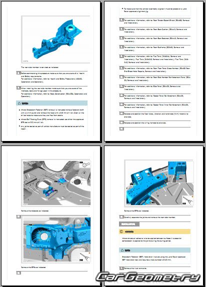 Информация по геометрическим размерам кузова Land Rover Discovery 5, контрольным точкам, изображения сечений кузовных элементов, применяемым материалам, рекомендации по применимым типам, методам, материалам и местам сварки; места и материалы для нанесения шовных, звукоизолирующих, антикоррозионных мастик; места и направления резки кузовных элементов для последующей установки новых; типы материалов интерьера, обозначение и расшифровка.