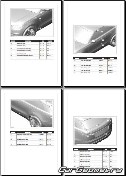 Заводское руководство на английском языке содержит размеры кузова Range Rover Velar (L560) 2017-2024 и включает кузовные размеры, контрольные точки геометрии кузова Рендж Ровер Велар Л560.