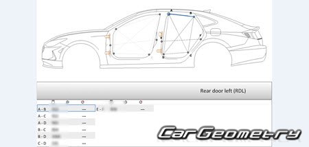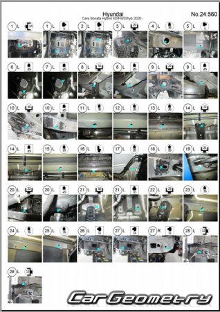 Информация по геометрическим размеры кузова Hyundai Sonata Hybrid с 2020, контрольным точкам, изображения сечений кузовных элементов, применяемым материалам, рекомендации по применимым типам, методам, материалам и местам сварки; места и материалы для нанесения шовных, звукоизолирующих, антикоррозионных мастик; места и направления резки кузовных элементов для последующей установки новых; типы материалов интерьера, обозначение и расшифровка.