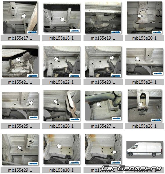 Кузовные размеры для восстановления геометрии кузова автомобилей Mercedes Sprinter (Type 907) с 2018. С помощью этих данных осуществляется проверка геометрии кузова с колесной базой 3250, 4325 и 3665мм , с последующей рихтовкой поврежденных частей автомобилей Мерседес Спринтер третьего поколения.