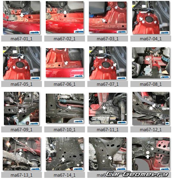 Кузовные размеры для восстановления геометрии кузова автомобилей Mazda 3 Hatchback (BP) 2019-2025. С помощью этих данных осуществляется проверка геометрии кузова, с последующей рихтовкой поврежденных частей автомобилей Мазда 3 четвертого поколения.