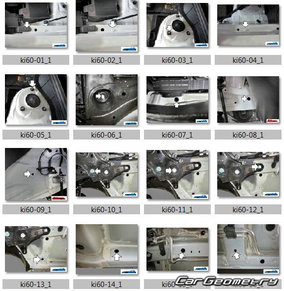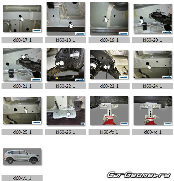 Заводское руководство содержит размеры кузова Kia Sorento (MQ4) с 2021 и включает описание замены различных элементов кузова и кузовные размеры, контрольные точки геометрии кузова Киа Соренто четвертого поколения.