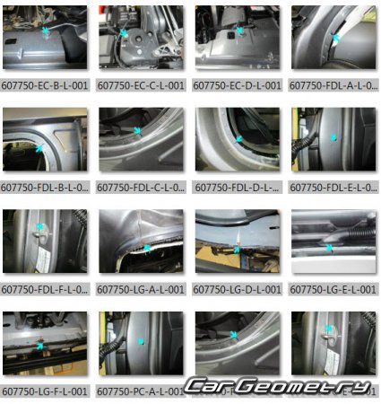 Информация по контрольным размеры кузова Ford Bronco Sport 2021-2027, контрольным точкам, изображения сечений кузовных элементов, применяемым материалам, рекомендации по применимым типам, методам, материалам и местам сварки; места и материалы для нанесения шовных, звукоизолирующих, антикоррозионных мастик; места и направления резки кузовных элементов для последующей установки новых; типы материалов интерьера, обозначение и расшифровка.