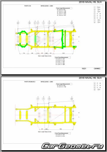 Кузовные размеры для восстановления геометрии кузова автомобилей Haval H9 2015-2022. С помощью этих данных осуществляется проверка геометрии кузова, с последующей рихтовкой поврежденных частей автомобилей Хавел H9.