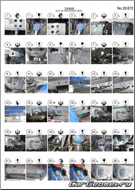 Кузовные размеры для восстановления геометрии кузова автомобилей Lexus NX250, NX350, NX350h 2021-2027. С помощью этих данных осуществляется проверка геометрии кузова AAZA20, AAZA25, AAZH20, AAZH25, TAZA25 с последующей рихтовкой поврежденных частей автомобилей Лексус NX.