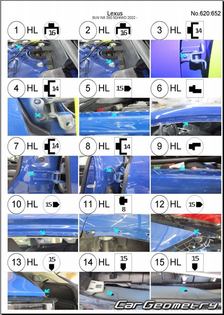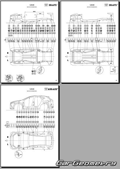 Информация по геометрическим размеры кузова Lexus NX250, NX350, NX350h (AAZA20, AAZA25, AAZH20, AAZH25, TAZA25), контрольным точкам, изображения сечений кузовных элементов, применяемым материалам, рекомендации по применимым типам, методам, материалам и местам сварки; места и материалы для нанесения шовных, звукоизолирующих, антикоррозионных мастик; места и направления резки кузовных элементов для последующей установки новых; типы материалов интерьера, обозначение и расшифровка.