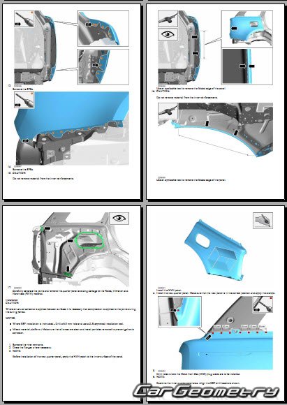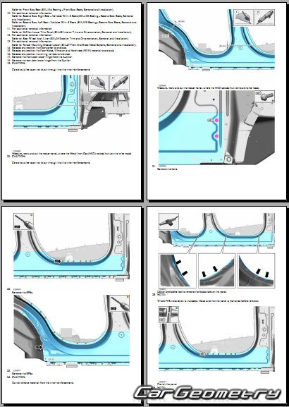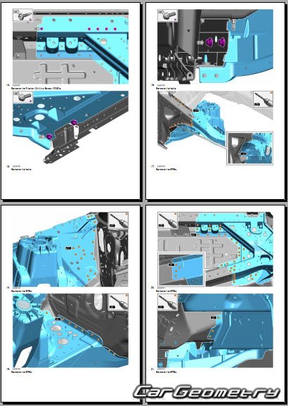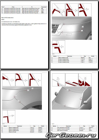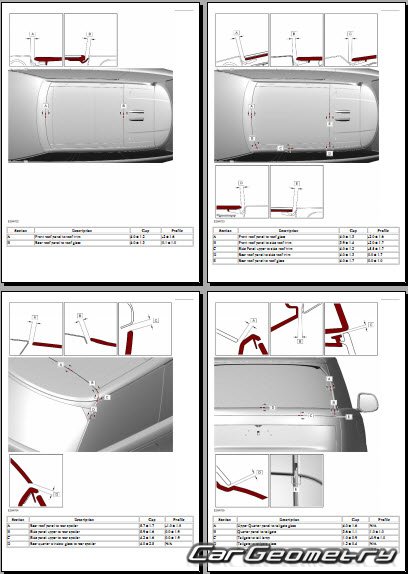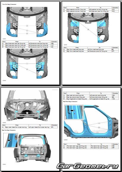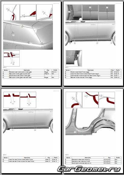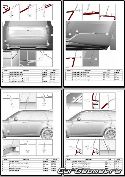 Информация по геометрическим размеры кузова Range Rover L460: контрольным точкам; изображения сечений кузовных элементов; применяемым материалам; рекомендации по применимым типам, методам, материалам и местам сварки; места и материалы для нанесения шовных, звукоизолирующих, антикоррозионных мастик; участки и направления резки элементов для последующей установки новых; типы материалов интерьера, обозначение и расшифровка.