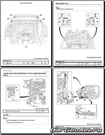 Информация по геометрическим размеры кузова Nissan Titan 2016-2024: контрольным точкам; изображения сечений кузовных элементов; применяемым материалам; рекомендации по применимым типам, методам, материалам и местам сварки; места и материалы для нанесения шовных, звукоизолирующих, антикоррозионных мастик; участки и направления резки элементов для последующей установки новых; типы материалов интерьера, обозначение и расшифровка.