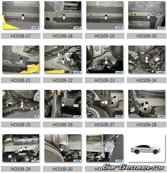 Информация по геометрическим размеры кузова Honda Accord 2023-2029, контрольным точкам, изображения сечений кузовных элементов, применяемым материалам, рекомендации по применимым типам, методам, материалам и местам сварки; места и материалы для нанесения шовных, звукоизолирующих, антикоррозионных мастик; места и направления резки кузовных элементов для последующей установки новых; типы материалов интерьера, обозначение и расшифровка.