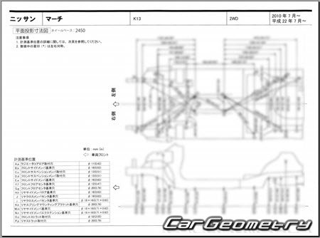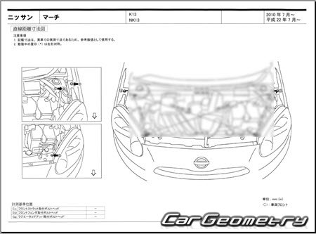 Выборка из стендовых баз и заводской документации по Nissan March 2010-2022 Body dimensions на японском языке, стендовые размеры кузова и контрольные точки геометрии Ниссан Марч с правым расположением руля.