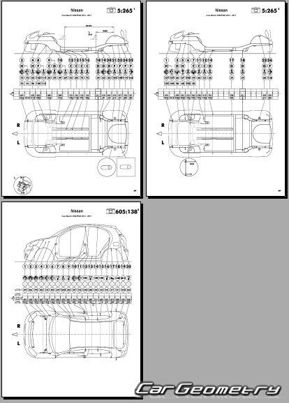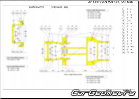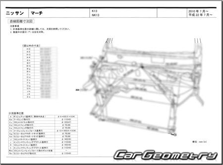 Кузовные размеры для восстановления геометрии кузова автомобилей Nissan March (K13 NK13) 2010-2022. С помощью этих данных осуществляется проверка геометрии кузова 5DR, с последующей рихтовкой поврежденных частей автомобилей Ниссан Марч К13 правый руль для японского рынка.