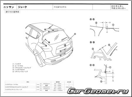 Выборка из стендовых баз и заводской документации по Nissan Juke 2010-2019 Body dimensions (на японском языке), стендовые размеры кузова и контрольные точки геометрии Ниссан Жук с правым расположением руля.
