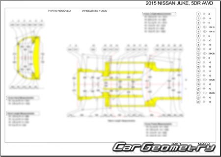 Кузовные размеры для восстановления геометрии кузова автомобилей Nissan Juke (F15 NF15 YF15) 2010-2019 (RH Japanese market) Body dimensions. С помощью этих данных осуществляется проверка геометрии кузова, с последующей рихтовкой поврежденных частей автомобилей Ниссан Жук правый руль для рынка Японии.