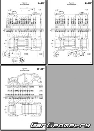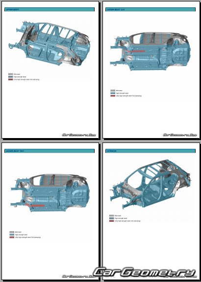 Информация по геометрическим размеры кузова Hyundai Creta SU2, контрольным точкам, изображения сечений кузовных элементов, применяемым материалам, рекомендации по применимым типам, методам, материалам и местам сварки; места и материалы для нанесения шовных, звукоизолирующих, антикоррозионных мастик; места и направления резки кузовных элементов для последующей установки новых; типы материалов интерьера, обозначение и расшифровка.