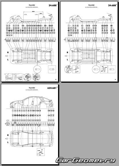 Заводское руководство содержит размеры кузова Hyundai Sonata (DN8) 2024-2026 и включает описание замены различных элементов кузова и кузовные размеры, контрольные точки геометрии кузова Хендай Соната рестайлинг седьмого поколения.