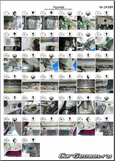 Информация по геометрическим размеры кузова Hyundai Sonata 2024-2026, контрольным точкам, изображения сечений кузовных элементов, применяемым материалам, рекомендации по применимым типам, методам, материалам и местам сварки; места и материалы для нанесения шовных, звукоизолирующих, антикоррозионных мастик; места и направления резки кузовных элементов для последующей установки новых; типы материалов интерьера, обозначение и расшифровка.