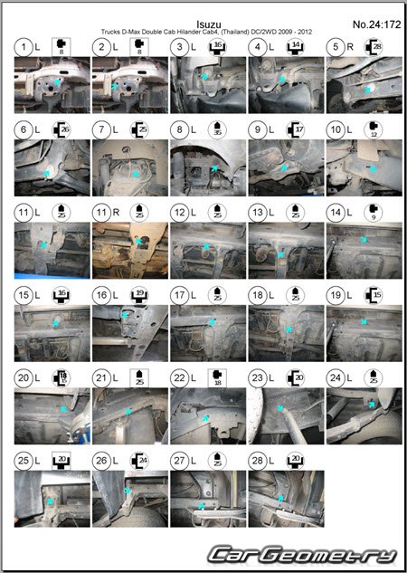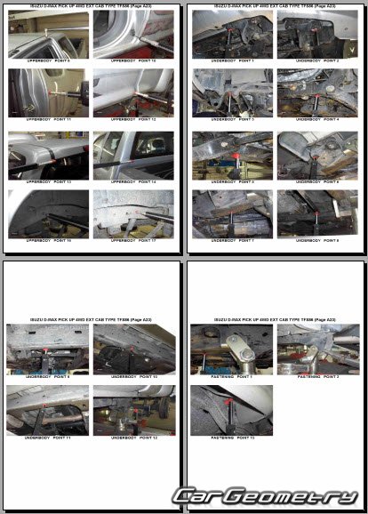 Кузовные размеры Isuzu D-Max 2007-2012 для восстановления геометрии кузова. С помощью этих данных осуществляется проверка геометрии кузова с колесной формулой Extended Cab и Crew Cab, с последующей рихтовкой поврежденных частей автомобилей Исузу Д-Макс.