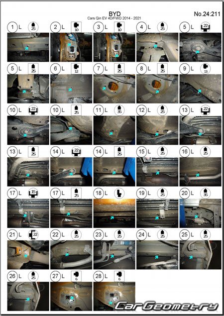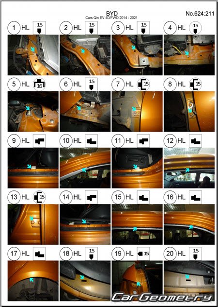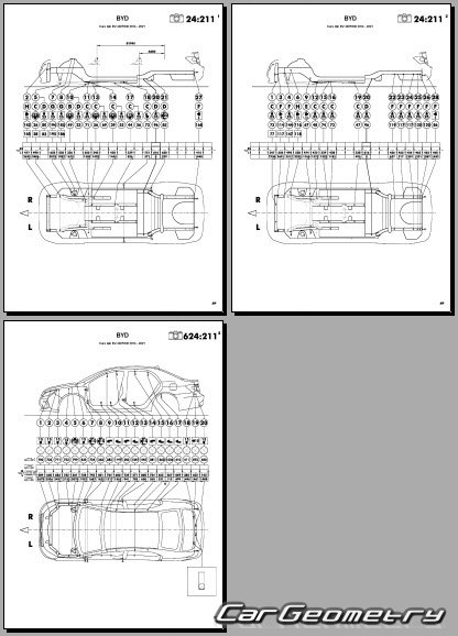 Кузовные размеры для восстановления геометрии кузова автомобилей BYD Qin 2014–2021. С помощью этих данных осуществляется проверка геометрии кузова Sedan, с последующей рихтовкой поврежденных частей автомобилей БИД Квин (Включая версию EV).