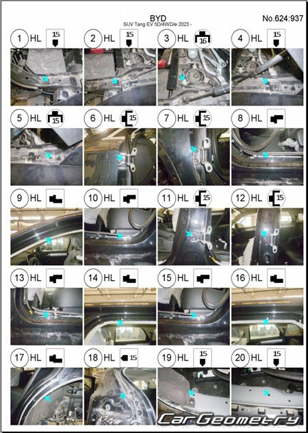 Руководство по кузовным работам BYD Tang EV 2023–2030 Body Repair Manual на английском языке содержит 148 страниц исключительно полезной и необходимой информации для мастеров, которые проверяют геометрию кузова после ДТП и хотят выполнить восстановление БИД Танг ЕВ согласно рекомендациям завода изготовителя.