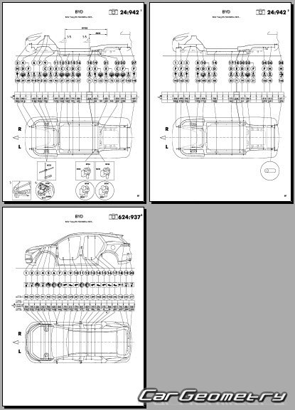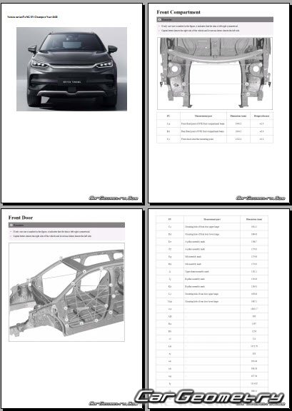 Заводское руководство на английском языке содержит размеры кузова BYD Tang EV 2023–2030 и включает кузовные размеры, контрольные точки геометрии кузова БИД Танг ЕВ.
