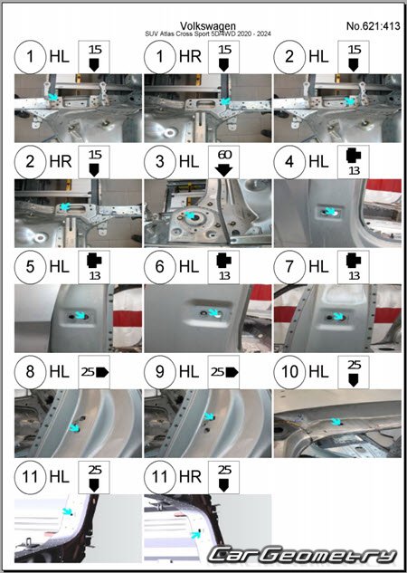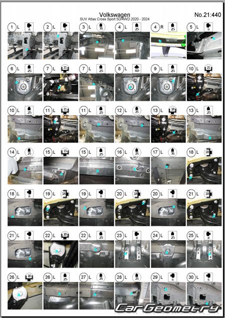 Кузовные размеры Volkswagen Atlas Cross Sport 2020-2024 для проверки и восстановления геометрии кузова с колесной базой 2979 мм. С помощью этих данных осуществляется проверка геометрии кузова, с последующей рихтовкой поврежденных частей Фольксваген Атлас Кросс Спорт.