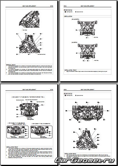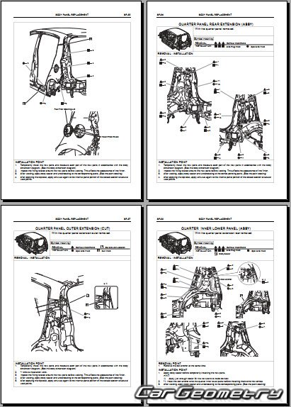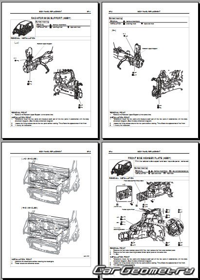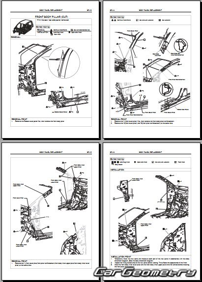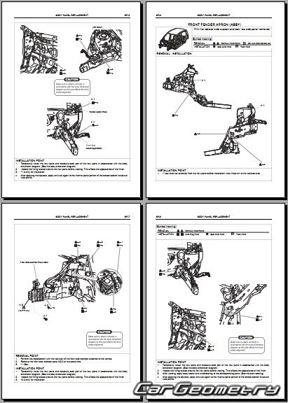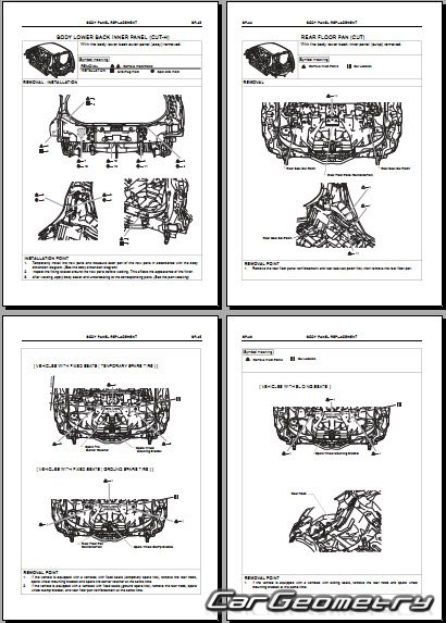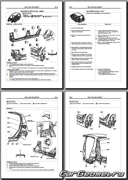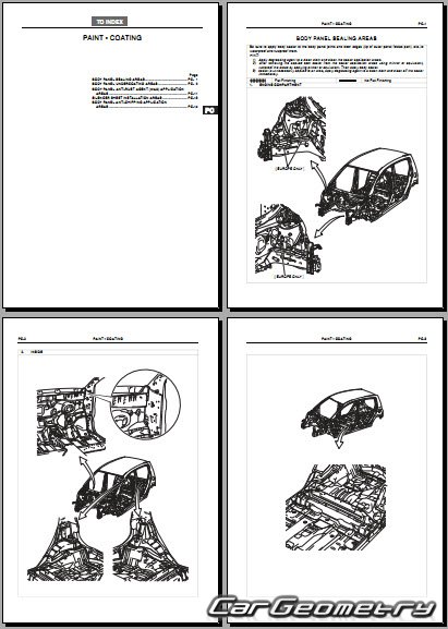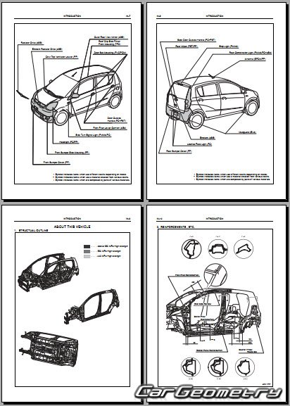 Информация по геометрическим размеры кузова Daihatsu Cuore и Charade, контрольным точкам, изображения сечений кузовных элементов, применяемым материалам, рекомендации по применимым типам, методам, материалам и местам сварки; места и материалы для нанесения шовных, звукоизолирующих, антикоррозионных мастик; места и направления резки кузовных элементов для последующей установки новых; типы материалов интерьера, обозначение и расшифровка.