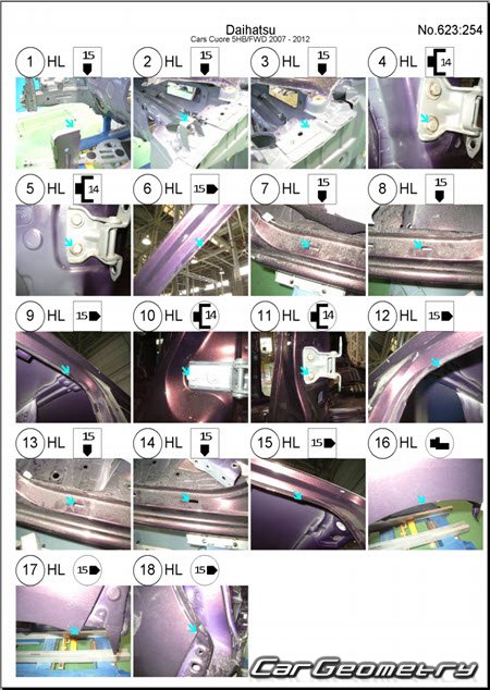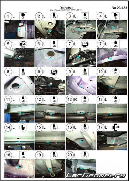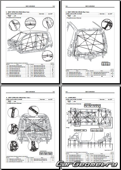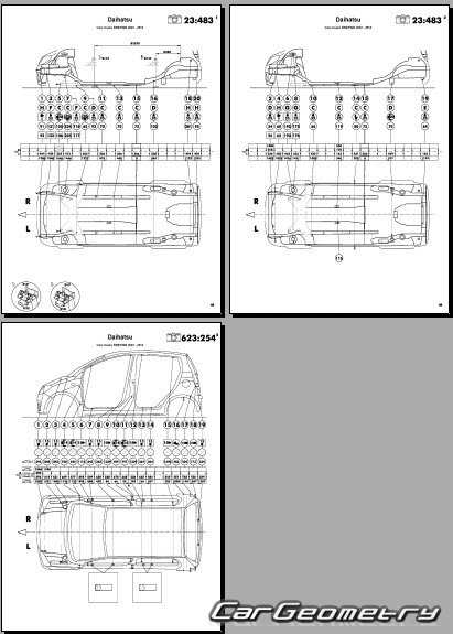 Размеры кузова для восстановления геометрии кузова автомобилей Daihatsu Cuore & Charade (L276) 2007-2013. С помощью этих данных осуществляется проверка геометрии кузова (3DR, 5DR), с последующей рихтовкой поврежденных частей автомобилей Дайхатсу Шарада и Куоре с правый и левым рулем.