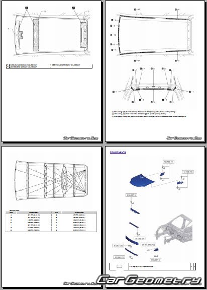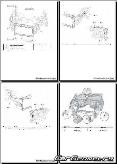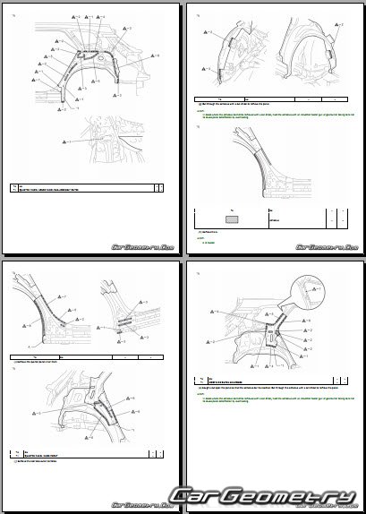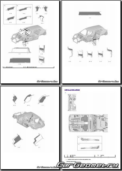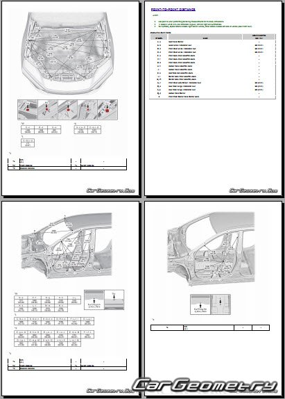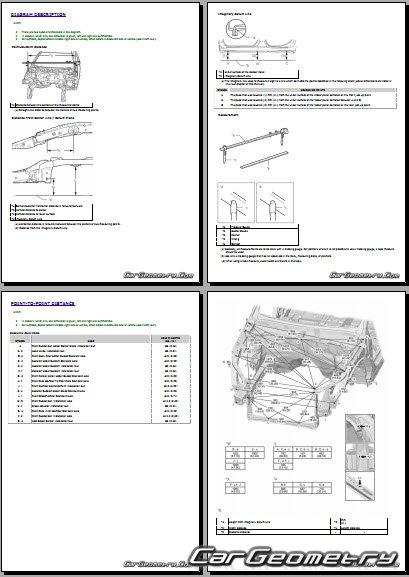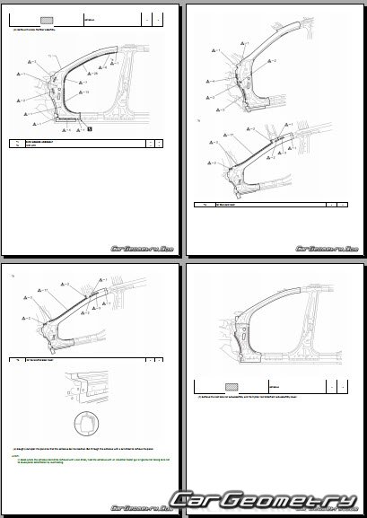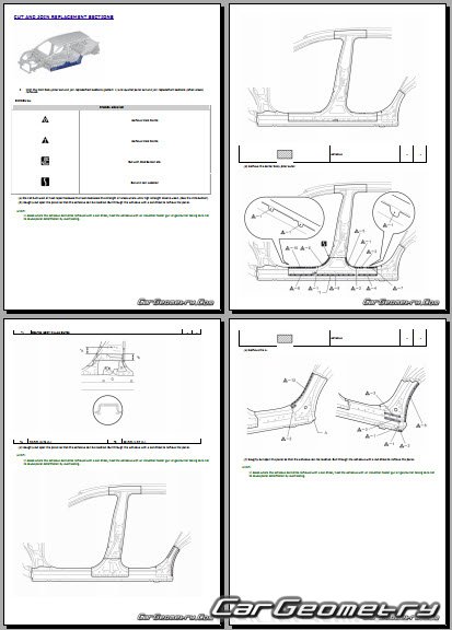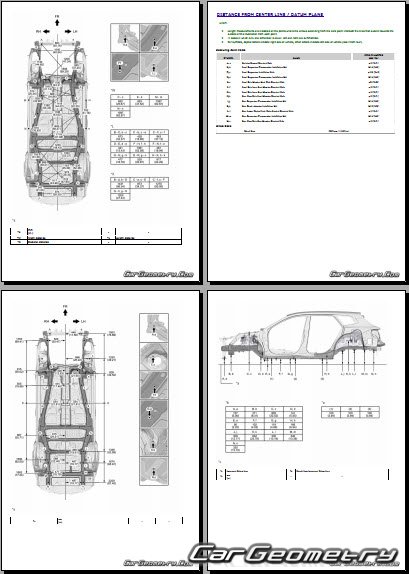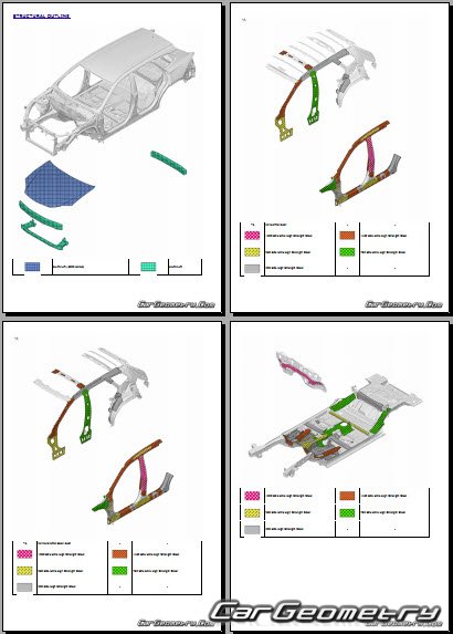 Информация по геометрическим размеры кузова Toyota Crown Signia, контрольным точкам, изображения сечений кузовных элементов, применяемым материалам, рекомендации по применимым типам, методам, материалам и местам сварки; места и материалы для нанесения шовных, звукоизолирующих, антикоррозионных мастик; места и направления резки кузовных элементов для последующей установки новых; типы материалов интерьера, обозначение и расшифровка.