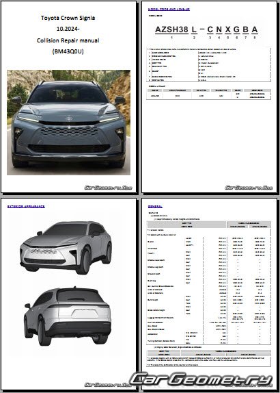 Руководство для фирменных СТО по ремонту повреждений кузова, полученных при столкновении для Toyota Crown Signia (AZSH38) 2025-2030 (Collision Repair Manual) 315 страниц на английском языке. Данный сборник содержит огромное количество исключительно полезной и необходимой информации для занимающихся кузовным ремонтом самостоятельно и владельцев фирм по кузовному ремонту автомобилей Тойота Краун Сигма.