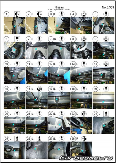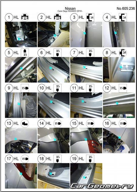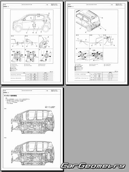 Кузовные размеры для восстановления геометрии кузова автомобилей Nissan Dayz и Dayz Highway Star (B43W B44W B45W B46W B47W B48W) 2024-2027. С помощью этих данных осуществляется проверка геометрии кузова, с последующей рихтовкой поврежденных частей автомобилей Ниссан Дейз и Дейз Хайвей Стар правый руль для японского рынка.