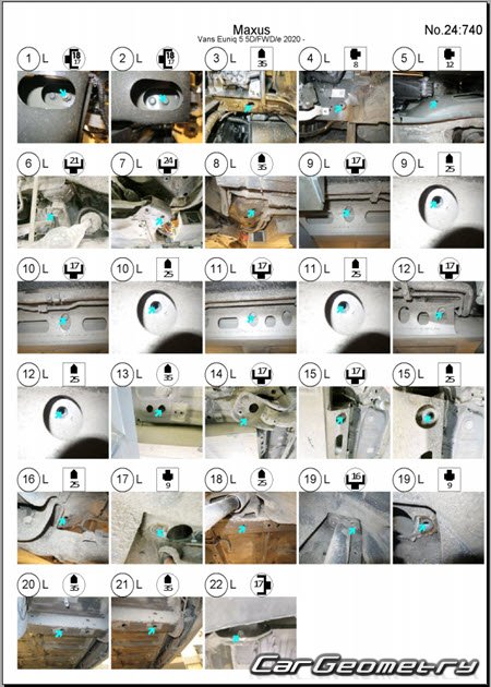Кузовные размеры для восстановления геометрии кузова автомобилей Maxus Euniq5 2020-2025. С помощью этих данных осуществляется проверка геометрии кузова, с последующей рихтовкой поврежденных частей автомобилей Максус Еуник5.