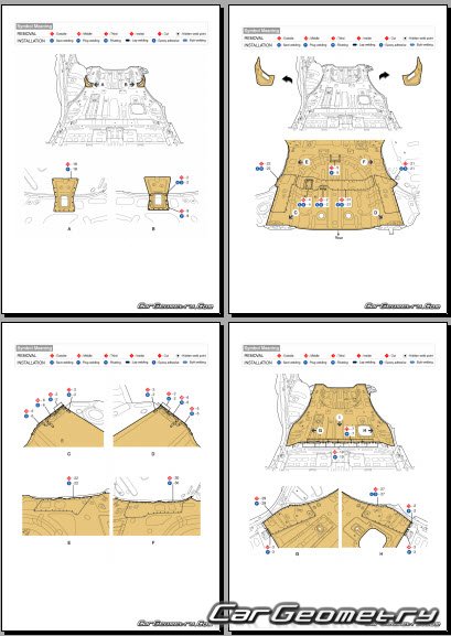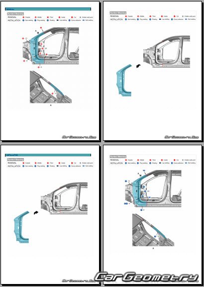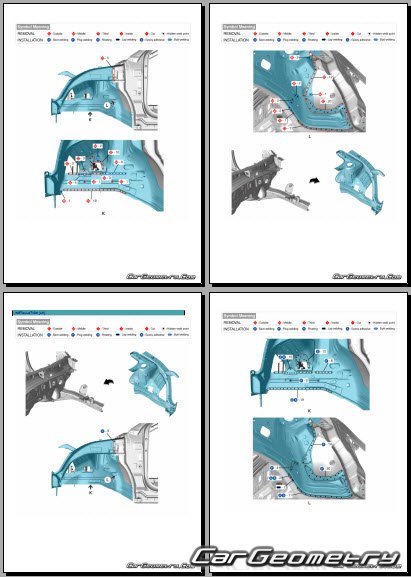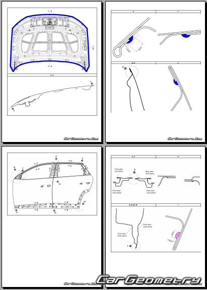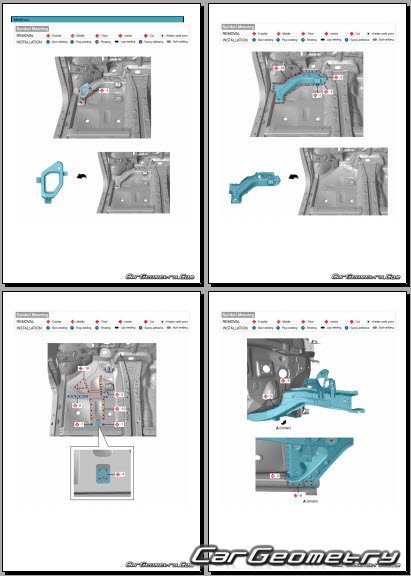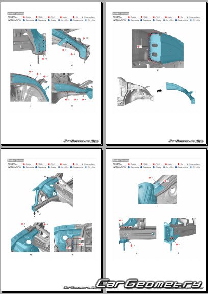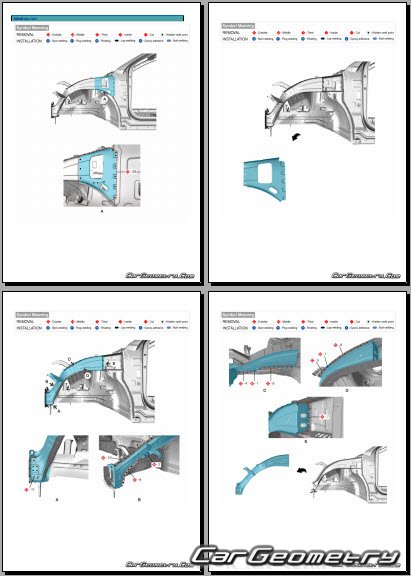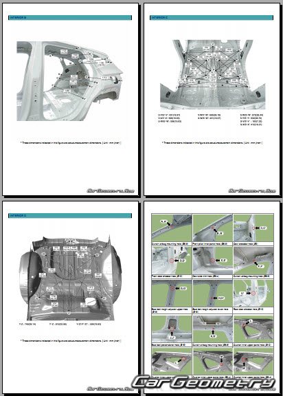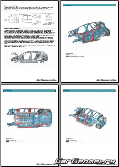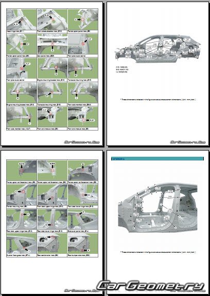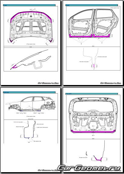 Информация по геометрическим размеры кузова Hyundai Tucson NX4e, контрольным точкам, изображения сечений кузовных элементов, применяемым материалам, рекомендации по применимым типам, методам, материалам и местам сварки; места и материалы для нанесения шовных, звукоизолирующих, антикоррозионных мастик; места и направления резки кузовных элементов для последующей установки новых; типы материалов интерьера, обозначение и расшифровка.