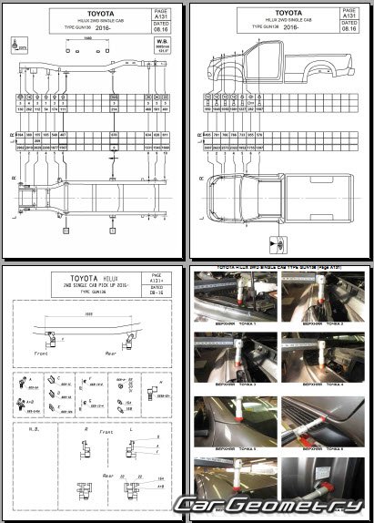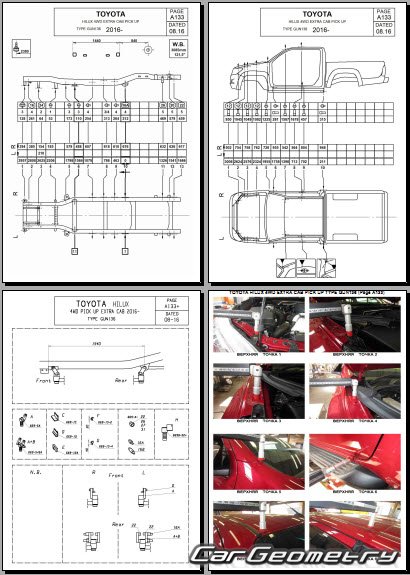 Кузовные размеры для восстановления геометрии кузова автомобилей Toyota Hilux (TGN121 TGN136 GUN126) 2020-2025. С помощью этих данных осуществляется проверка геометрии кузова, с последующей рихтовкой поврежденных частей автомобилей Тойота Хюликс восьмого поколения.
