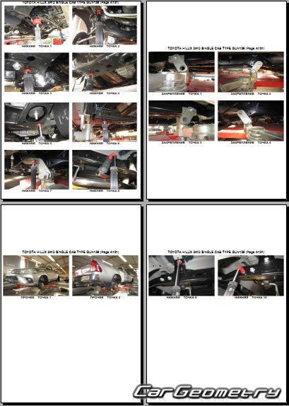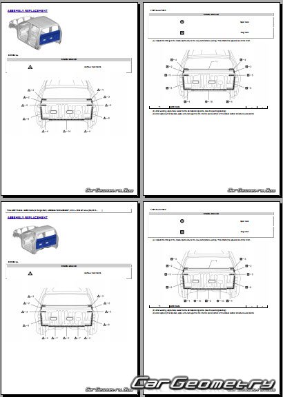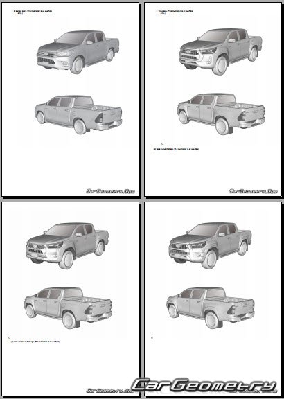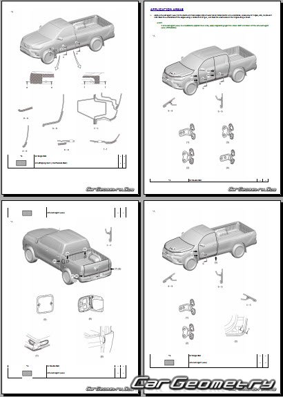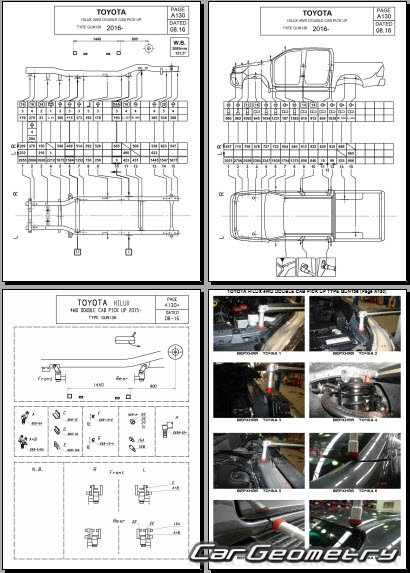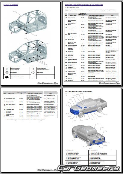 Информация по геометрическим размеры кузова Toyota Hilux, контрольным точкам, изображения сечений кузовных элементов, применяемым материалам, рекомендации по применимым типам, методам, материалам и местам сварки; места и материалы для нанесения шовных, звукоизолирующих, антикоррозионных мастик; места и направления резки кузовных элементов для последующей установки новых; типы материалов интерьера, обозначение и расшифровка.