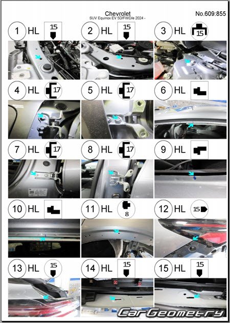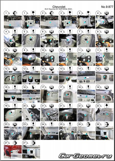 Кузовные размеры для восстановления геометрии кузова Chevrolet Equinox EV 2024–2030. С помощью этих данных осуществляется проверка геометрии кузова, с последующей рихтовкой поврежденных частей Шевроле Эквинокс ЕВ.