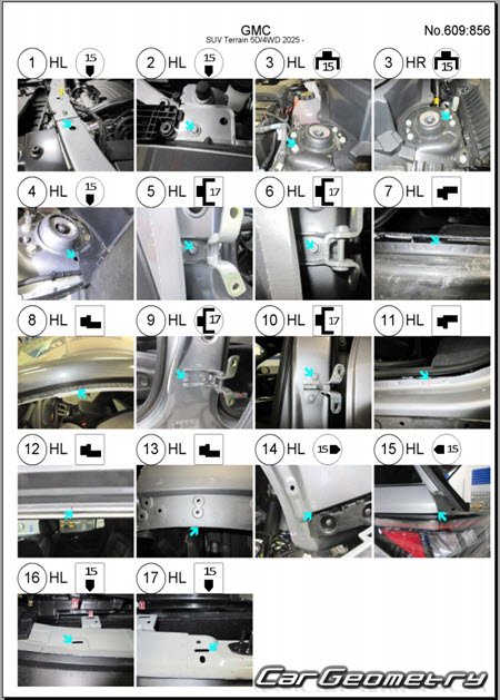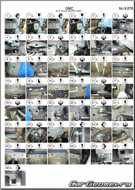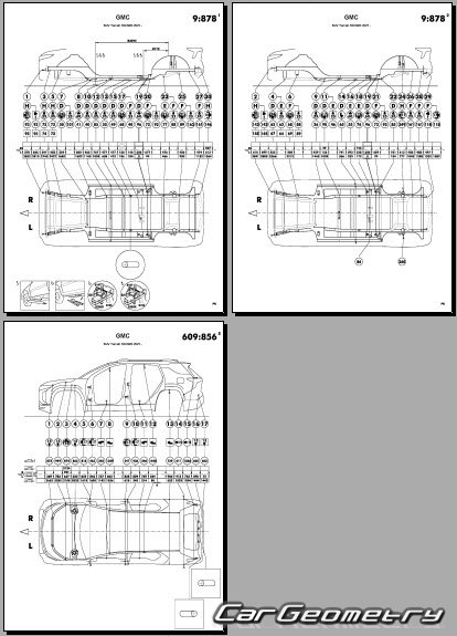 Кузовные размеры GMC Terrain 2025-2030 для восстановления геометрии кузова. С помощью этих данных осуществляется проверка геометрии кузова, с последующей рихтовкой поврежденных частей автомобилей GMC Террейн.