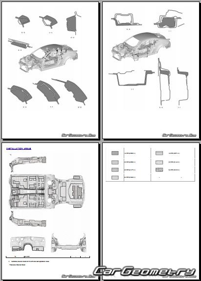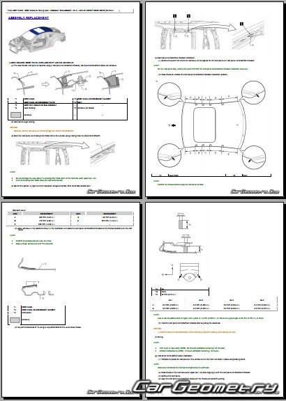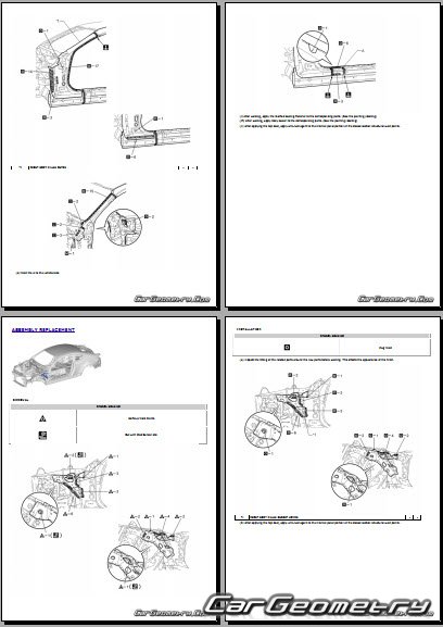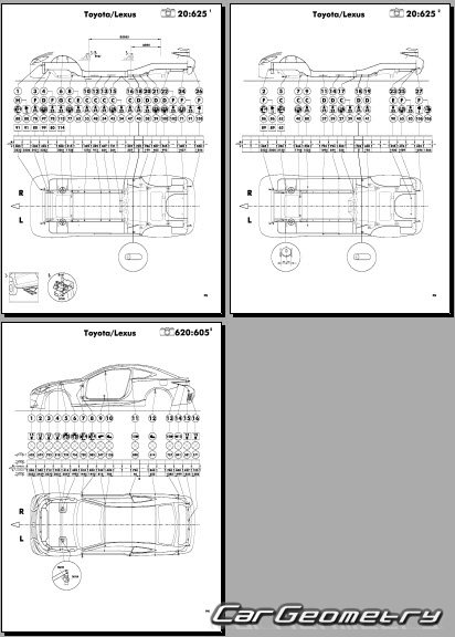 Информация по геометрическим размеры кузова Lexus RC200T, RC300, RC350 2021-2024 Collision Repair manual , контрольным точкам, изображения сечений кузовных элементов, применяемым материалам, рекомендации по применимым типам, методам, материалам и местам сварки; места и материалы для нанесения шовных, звукоизолирующих, антикоррозионных мастик; места и направления резки кузовных элементов для последующей установки новых; типы материалов интерьера, обозначение и расшифровка.