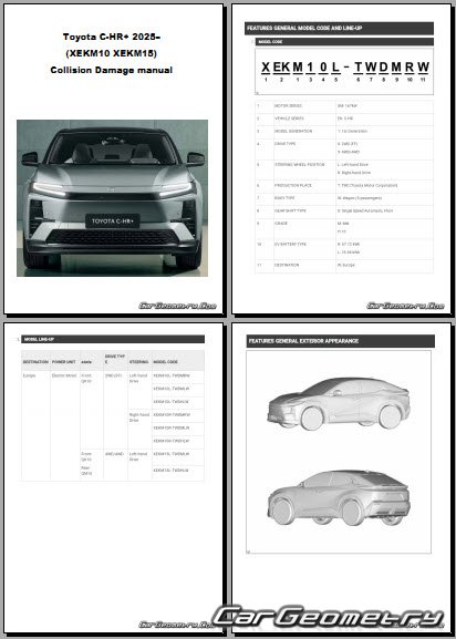 Руководство для фирменных СТО по ремонту повреждений кузова, полученных при столкновении для Toyota C-HR+ 2025-2030 (Collision Repair Manual) 269 страниц на английском языке. Данный сборник содержит огромное количество исключительно полезной и необходимой информации для занимающихся кузовным ремонтом самостоятельно и владельцев фирм по кузовному ремонту автомобилей Тойота C-HR плюс.