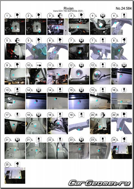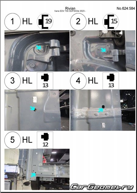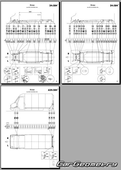 Кузовные размеры для восстановления геометрии кузова Rivian EDV 700 2023-2029. С помощью этих данных осуществляется проверка геометрии кузова Van, с последующей рихтовкой поврежденных частей автомобилей Ривиан 700 Ван.