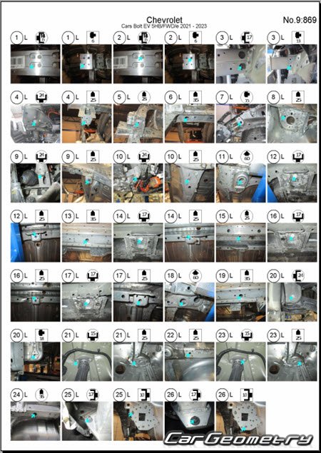 Кузовные размеры Chevrolet Bolt EV 2021–2023 для восстановления геометрии кузова. С помощью этих данных осуществляется проверка геометрии кузова, с последующей рихтовкой поврежденных частей автомобилей Шевроле Болт ЕВ.