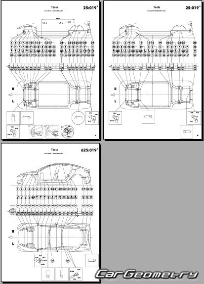 Кузовные размеры для восстановления геометрии кузова Tesla Model 3 2024-2029. С помощью этих данных осуществляется проверка геометрии кузова, с последующей рихтовкой поврежденных частей автомобилей Тесла Модель 3.