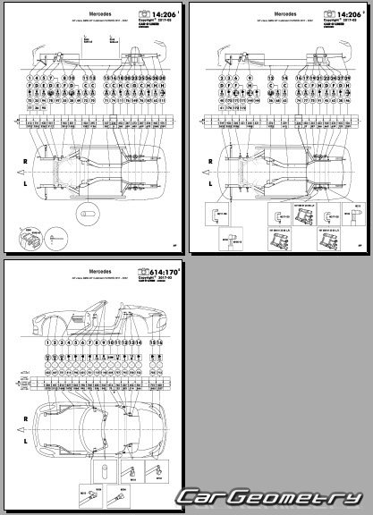 Выборка из различных стендовых баз по Mercedes AMG GT Cabrio (R190) Body dimensions, стендовые размеры кузова и контрольные точки геометрии Мерседес GT класса кабрио.