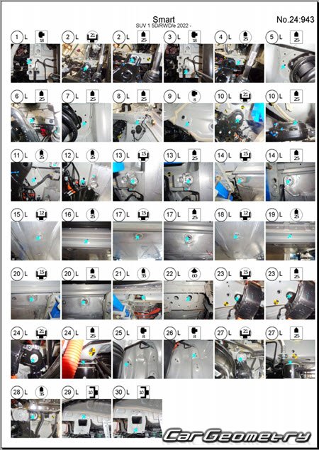Кузовные размеры Smart #1 2022-2028 для проверки и восстановления геометрии кузова. С помощью этих данных осуществляется проверка геометрии кузова, с последующей рихтовкой поврежденных частей Смарт #1.