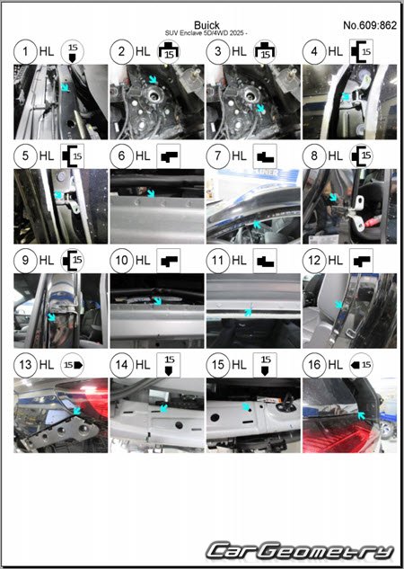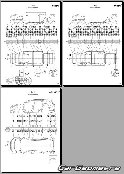 Кузовные размеры для восстановления геометрии кузова Buick Enclave 2024-2030. С помощью этих данных осуществляется проверка геометрии кузова, с последующей рихтовкой поврежденных частей автомобилей Бьюик Энклав.