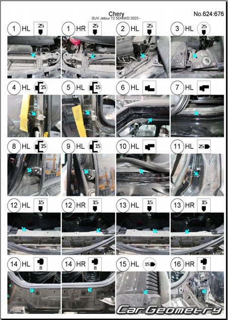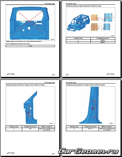 Заводское руководство по ремонту кузова Chery Jetour T2 с 2024 включает кузовные размеры, контрольные точки геометрии кузова T19C. С помощью этих данных осуществляется проверка геометрии кузова, с последующей рихтовкой поврежденных частей Джетур Т2.
