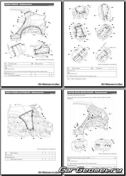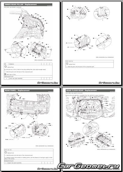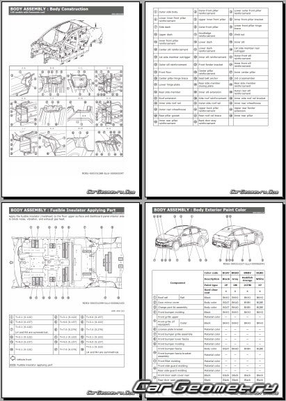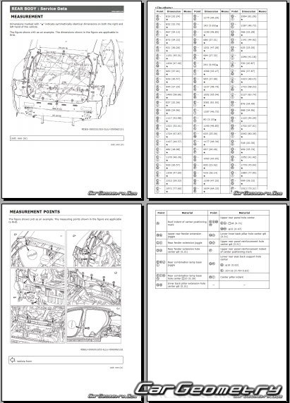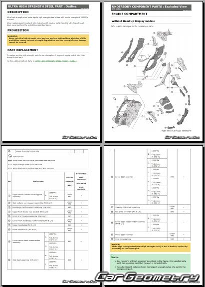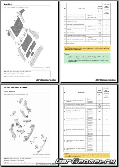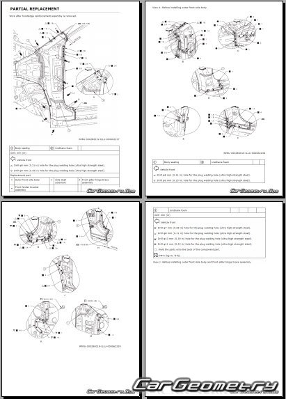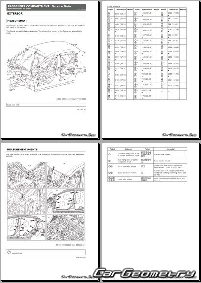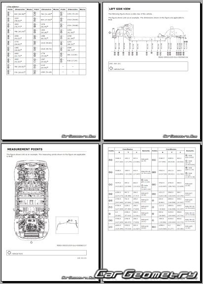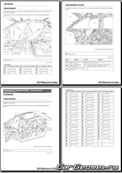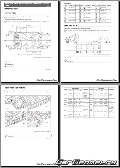 Информация по геометрическим размеры кузова Nissan Leaf 2025-2032: контрольным точкам; изображения сечений кузовных элементов; применяемым материалам; рекомендации по применимым типам, методам, материалам и местам сварки; места и материалы для нанесения шовных, звукоизолирующих, антикоррозионных мастик; участки и направления резки элементов для последующей установки новых; типы материалов интерьера, обозначение и расшифровка.
