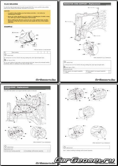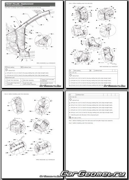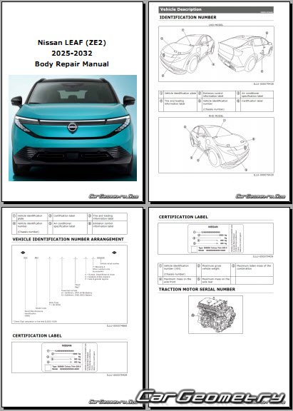 Руководство по кузовным работам Nissan Leaf (ZE2) 2025-2032 BodyShop Manual 173 страницы на английском языке исключительно полезной и необходимой информации для мастеров, которые проверяют геометрию кузова после ДТП и хотят выполнить восстановление кузова Ниссан Лиф согласно рекомендациям завода изготовителя.