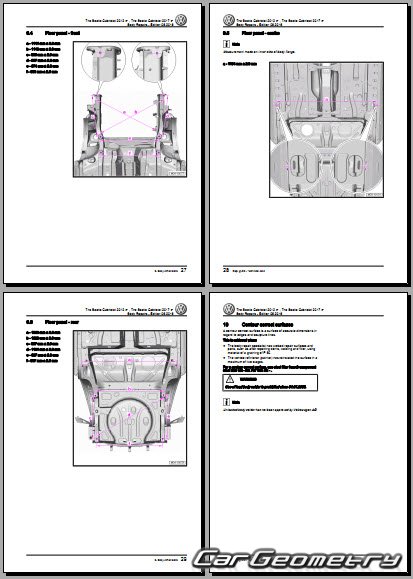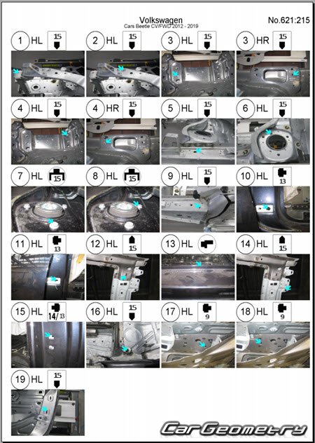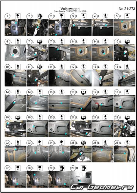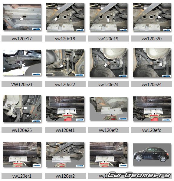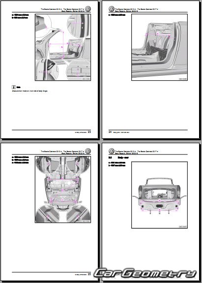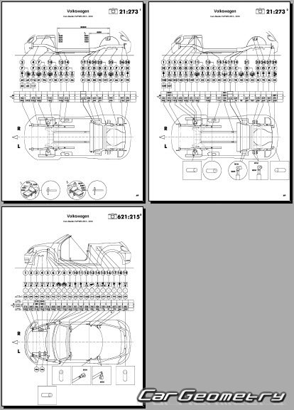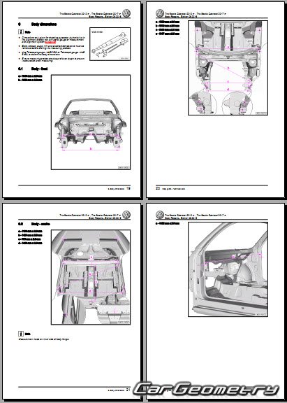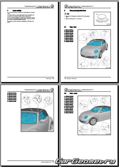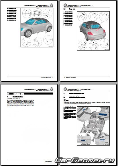 Заводское руководство содержит контрольные размеры кузова Volkswagen Beetle Cabriolet 2012-2019 Body Repair Manual и включает описание замены различных элементов кузова (Cabriolet), контрольные точки геометрии кузова Фольксваген Битл Жук.