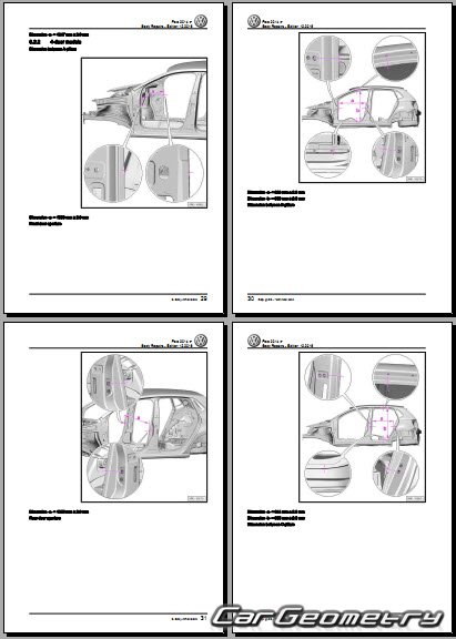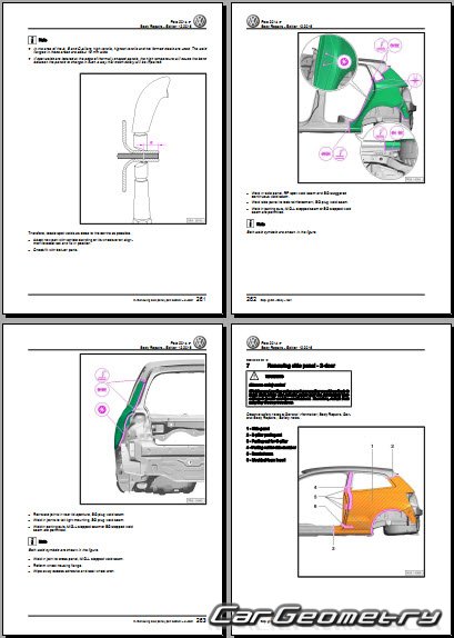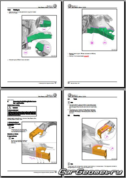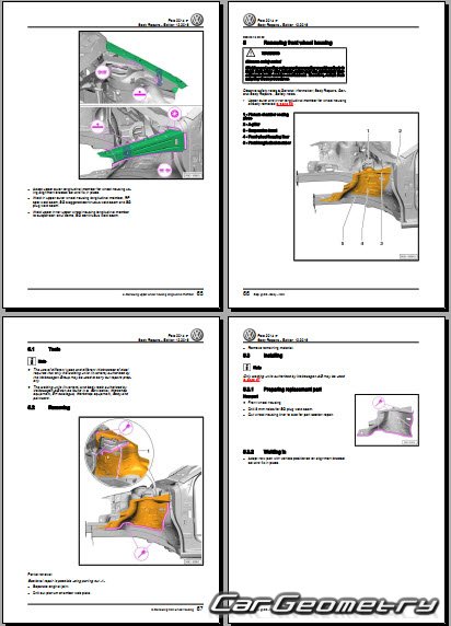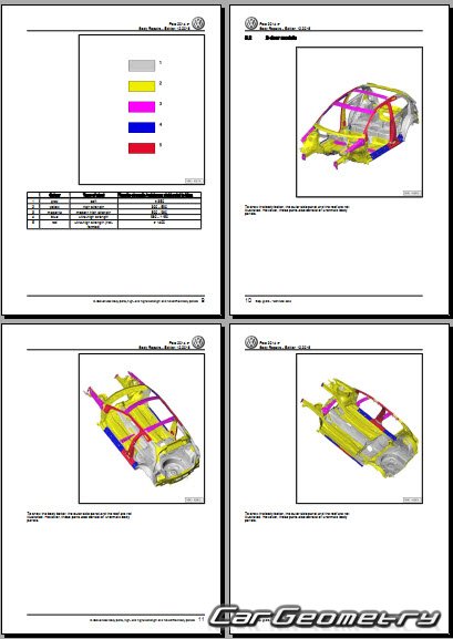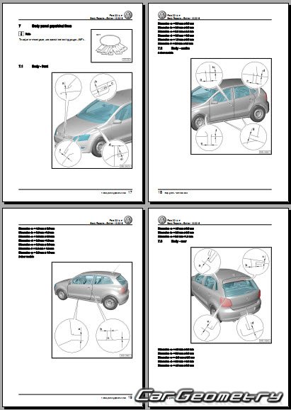 Заводское руководство содержит контрольные размеры кузова Volkswagen Polo (Typ 6R) 2009–2018 Body Repair Manual и включает описание замены различных элементов кузова (3DR 5DR Hatchback), контрольные точки геометрии кузова Фольксваген Гольф.